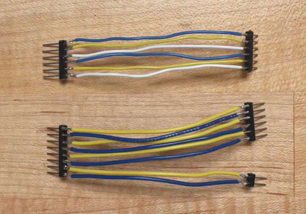 A continuación, hacer dos juegos de cables para conectar la placa de circuito de Arduino. El cable de señal del servo tiene cabeceras macho en ambos extremos, cada uno con 6 pines (uno por servo). El cable de señal de botón también tiene cabeceras macho en ambos extremos, pero tienen 8 pernos cada uno (uno por cada botón). Además, en un extremo separar dos de las patillas de los otros seis, como que va a ser conectados el lado opuesto de la Arduino.