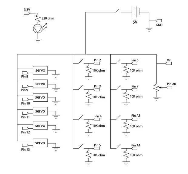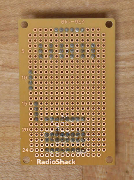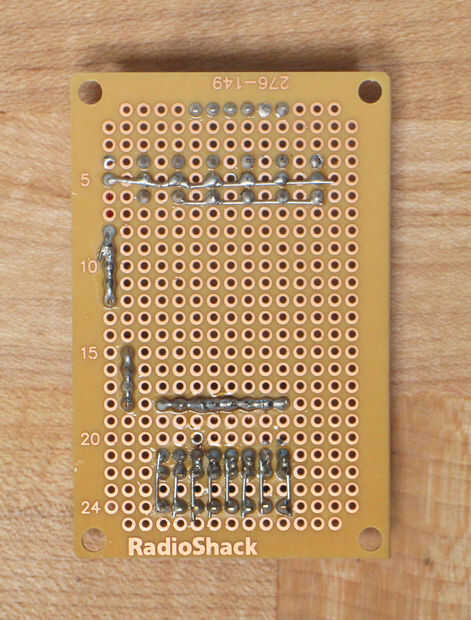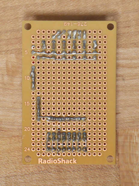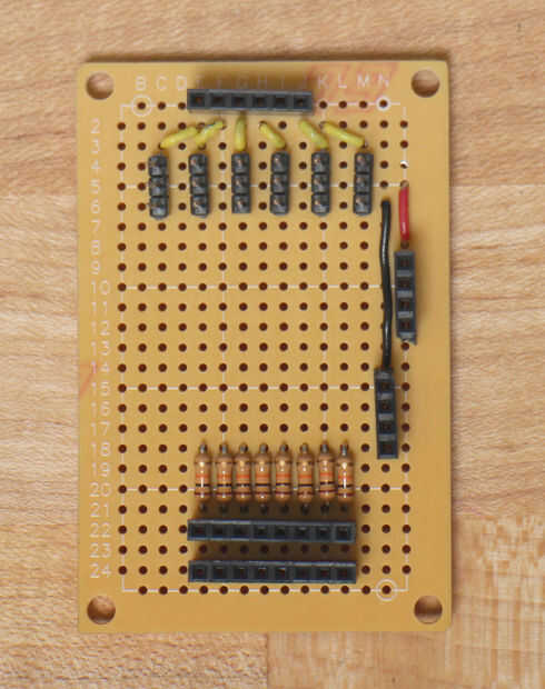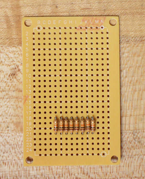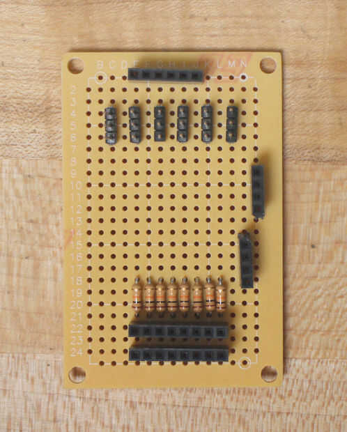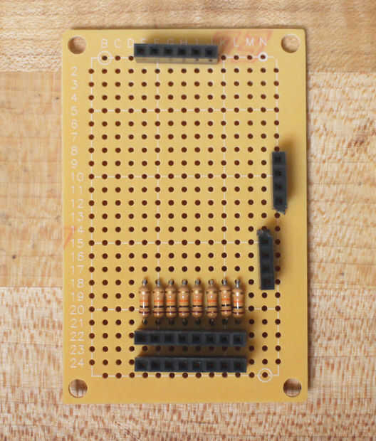 La placa de circuito para el brazo es sobre todo un método para dirigir eficientemente los diversos cables y señales, más que una manera de agregar más componentes. Comience con las resistencias, luego los conectores varios (nota que algunos de ellos son mujeres y un hombre). Por último, la soldadura en las conexiones.