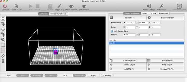Añadir el archivo STL a Repetier Host en la ficha de objeto de colocación, se debe ver la parte en la vista 3D