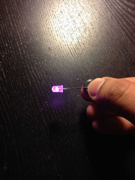 El LED de prueba, conecte el extremo largo del LED a la + final de ve de la batería (se debe ver un signo en un lado de la batería +) y el extremo más corto hasta el final - ve de la batería.