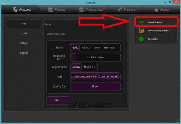 - Conecta tu cámara de OpenNI a un puerto USB del ordenador y empezar a Skanect. Si la cámara y OpenNI se instalan con éxito, se puede ver en la parte superior de la it´s en la ventana del programa, la detección de la cámara, como la siguiente imagen muestra