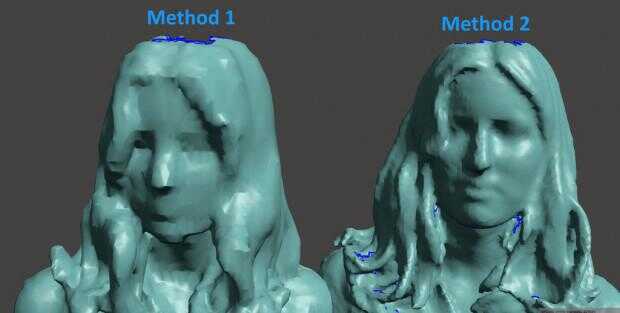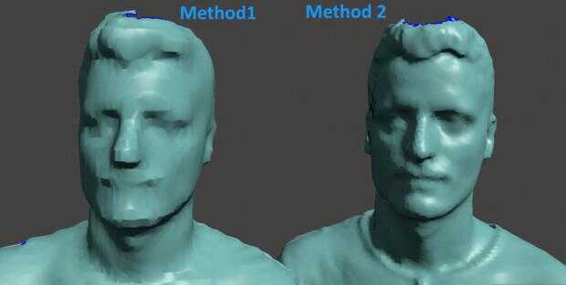 La calidad de la exploración de mi método es mucho mejor que la normal. Puedes ver que las mayores diferencias están alrededor de los ojos, nariz, boca y pelo. Básicamente, el segundo método tiene mucho más caras (triángulos de malla), y eso es todo si quieres un análisis 3D de alta resolución de tu cuerpo.