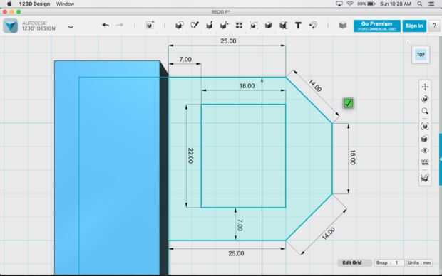 • Dibuje una línea de 25 mm de largo de la parte superior del prisma rectangular a 90 º este.
