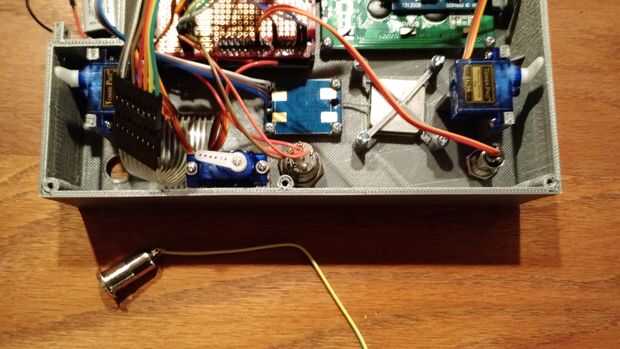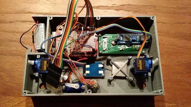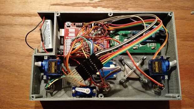Las puertas están cerradas por 3 micro servos. Los servos de puerta lado montan hacia los lados para que las puertas se le impide a caída libre. Cuando la puerta se abre, el servo se mueve fuera del camino y la puerta caerá abierta. Esta parte se puede abrir si el usuario pega algo pequeño dentro de la parte superior de la puerta y empuja el servo fuera del camino, pero que no consiguen astutos. El compartimiento principal no se abre de esta manera.