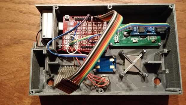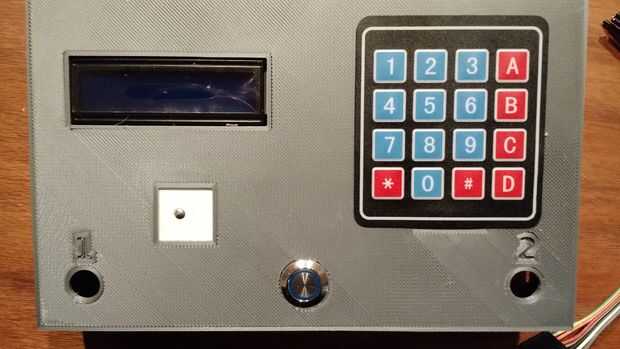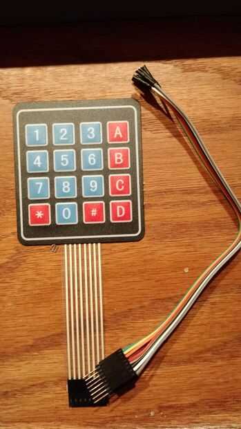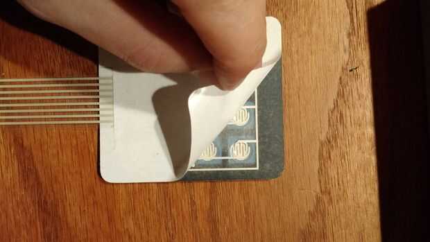 El teclado de membrana tiene una espalda pegajosa, así que puedes pelar el forro y ponerlo en el exterior de la caja. Deslice el conector desde el teclado a través de la ranura de la parte delantera y lo pega en su lugar. Usted puede utilizar macho a hembra de los cables para éste, o simplemente pegar algunos pernos de encabezado dentro del conector del teclado para conectar los cables de puente, después conéctelos a los pines 0-7 como se muestra en la imagen.