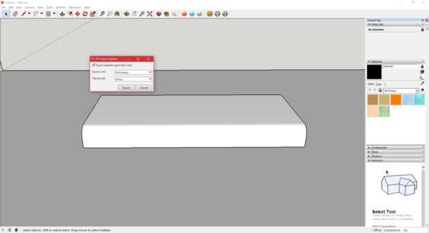 Cuando hayas terminado diseño su agarre de la cámara, seleccione su diseño (seleccione herramienta) y ve a archivo → exportar STL... Asegúrese de que está activada la casilla de verificación y elija las opciones milímetros y binario. El archivo STL se mostrará en la misma carpeta donde guardaste el archivo de Sketchup.