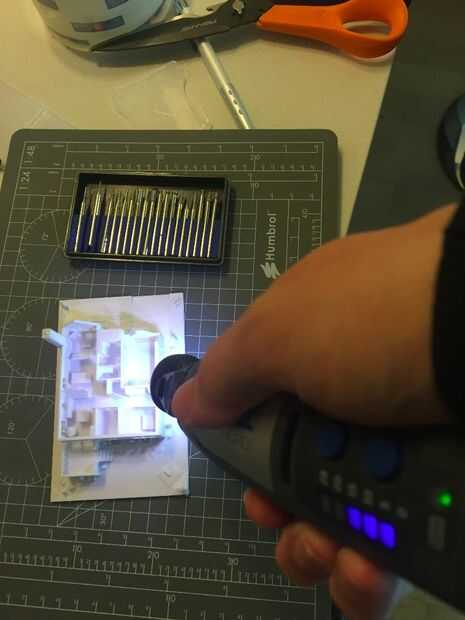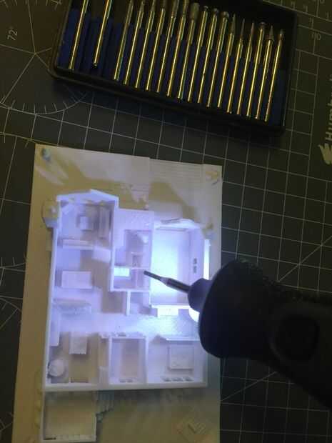 Después de imprimir, utilizar la Herramienta giratoria de Micro para quitar todas las imperfecciones debido a excesos o droopings. Esto es genial para las rebabas a través de manchas no deseadas y cuerdas de plástico en el modelo. Es inalámbrico y tiene varias velocidades de rotación. Usted puede comprar un conjunto independiente de Puntas de diamante de todas las formas y duración para trabajo de precisión al pulir el modelo.