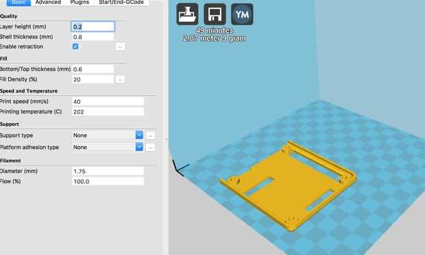Los valores en Cura decir que la parte superior lleva a 2,9 m de filamento con un tiempo de impresión de 49mins.