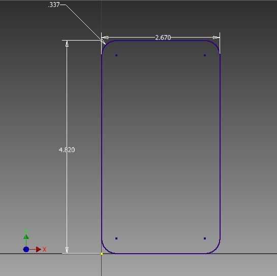 Con todos los datos y las mediciones, ahora podemos proceder a modelar el caso en su software de CAD favorito. Así que lo primero que debe hacer es delinear el interior de la caja, donde el teléfono se siente realmente. Una buena idea sería tomar un poco las dimensiones exactas reales del teléfono y "redondeo". Por ejemplo, si usted tiene una medida de pulgadas 2,011, puede rodearla hasta 2,02 pulgadas. Esto es porque si hace el caso de las mismas dimensiones exactas como el teléfono, no puede caber en el caso, así como te gustaría. La longitud exacta y la anchura de mi teléfono eran 4.814 y 2.662 respectivamente, pero redondea los 4.820 y 2.670. Alternativamente, puede utilizar el método de "Arena y taladro" que he mencionado anteriormente. El método de la arena y el taladro es cuando haces intencionalmente las dimensiones menor o igual el teléfono, entonces arena o perfore el plástico después de imprimirlo, para lograr un ajuste adecuado. Este método puede ser preferido sobre el otro método, porque puede conseguir un mejor ajuste; el otro método puede crear un caso un poco más blando. de todos modos, hacia el dibujo. Ahora usted tendrá que aplicar el radio del acuerdo a las esquinas del rectángulo en forma de caja que usted hizo. Ya que tengo un radio 0.337 filete, es lo que usé. Después de eso, puede utilizar sus increíbles habilidades de CAD para dibujar hacia fuera el resto de la caja del teléfono, pero recuerde que la forma que acaba de agregar el radio del acuerdo para el interior; Necesitará añadir el grosor de su caso solicitado fuera de él.