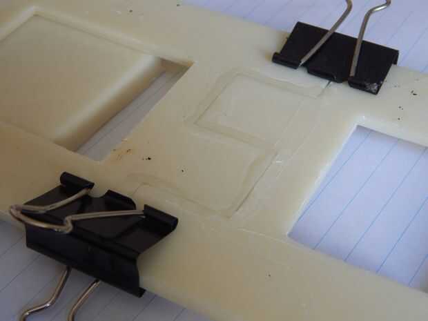 - Lo mismo para las piezas de la parte dos trasera. Usé un clip binder para la celebración de los bien alineados juntos. Espere hasta que el pegamento se seque completamente antes de pasar al siguiente paso.