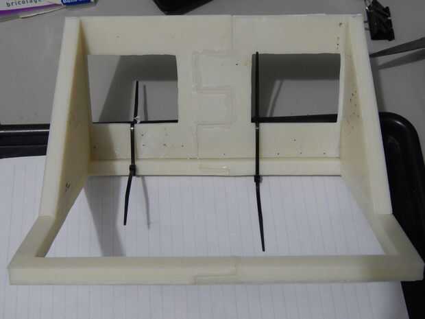 - Pegar el borde en la base de los triángulos, que también sería la parte superior de la estructura. Usé dos zip lazos apretar fuertemente para mantenerlos juntos mientras que izquierda para el secado.