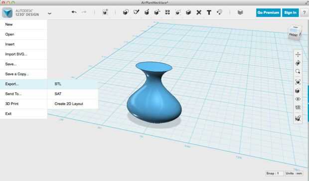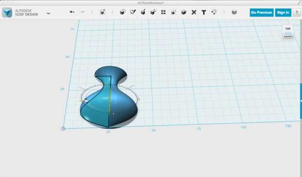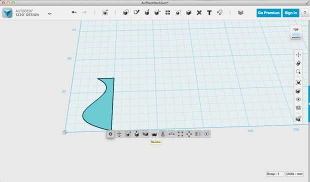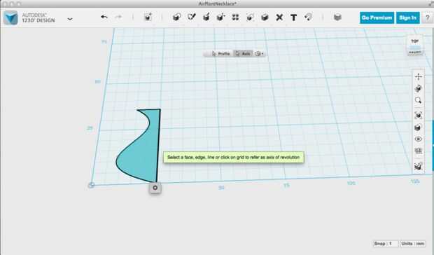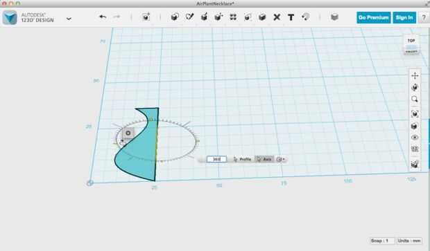 Cuando usted tiene una figura completa en 2d, haga clic en él, seleccione girar en el pequeño menú engranaje, haga clic en el lado derecho que será su eje y entrar en 360 en el cuadro número. Esto creará su forma redondeada. Mover y girar hasta que quede vertical. Quería que la parte inferior plana para facilitar la impresión, así que coloca una caja baja de traslapo en la base y restar las partes superpuestas.