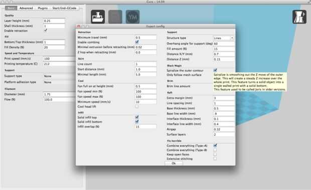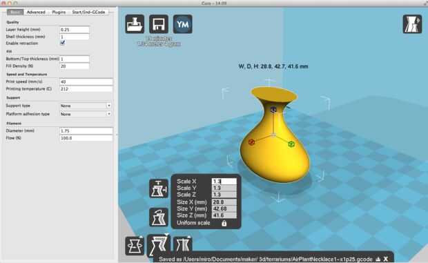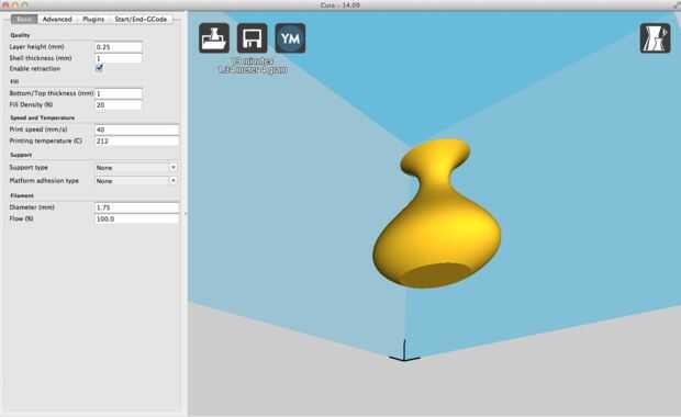 Usted notará que he creado un objeto sólido en el software de modelado 3d, más que un hueco. En lugar de vaciamiento del objeto, decidí utilizar Cura Spiralize valor (se encuentra en configuración de experto) para darle un muro capa bonita, delgada, solo. Especialmente utilizando un filamento claro como t flase, esto se ve bastante resbaladiza. Ajuste de Slic3r espiral Jarrón debe lograr lo mismo, aunque no he probado a mí mismo.