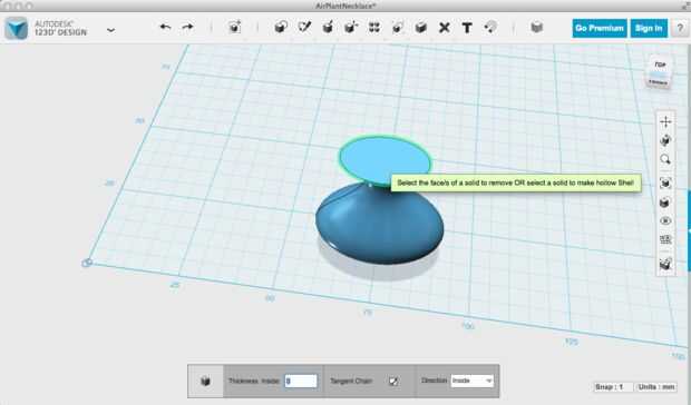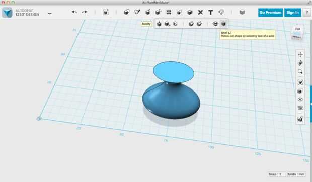 Si no tienes esta opción, también puede utilizar la herramienta de Shell en el 123D diseño para hacer la forma en un vaso hueco.