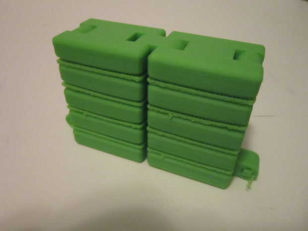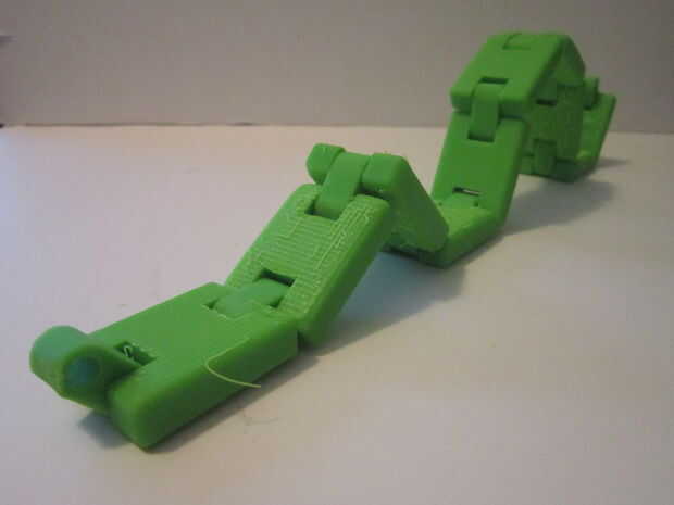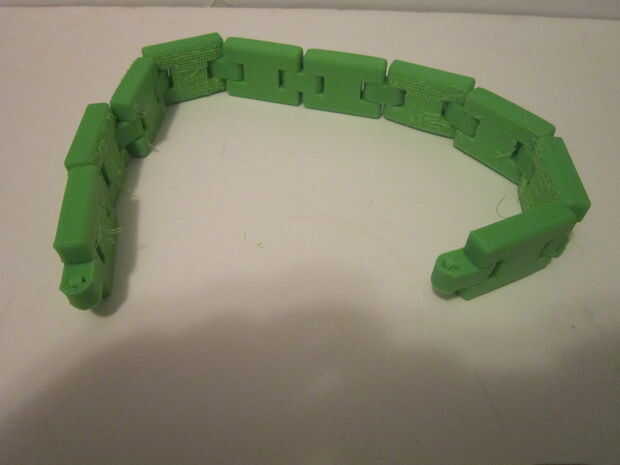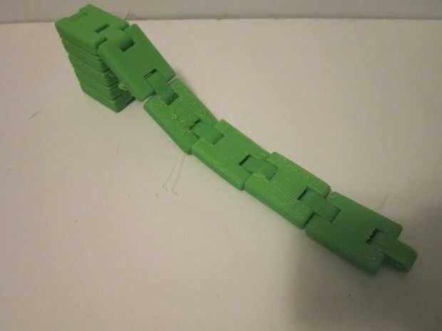 Después de haber impreso esta parte, es necesario retirar el material de apoyo. Usar un pequeño cuchillo con cuidado separar y retirar el material de apoyo de entre pedazos de cadena H. Entonces firmemente pero con cuidado pivote H-eslabón hasta que empiece a abrir la bisagra. Algunas cuerdas de plástico pueden han fusionado la pieza conector en su lugar, pero después de aplicar una presión firme, debe romper bien. Continúe este proceso hasta que han desplegado tanto las pilas de los eslabones de la cadena.