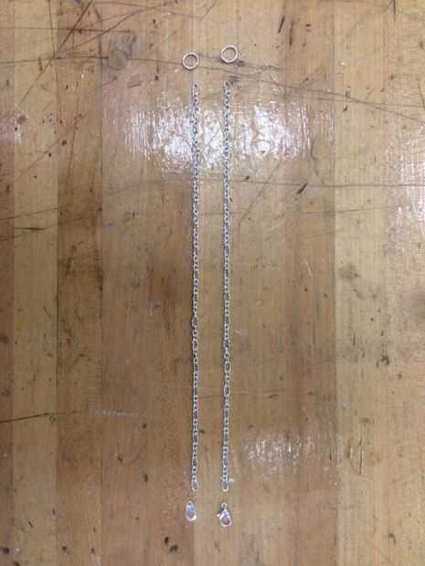 Abrir el anillo del salto e introducir la cadena dentro. A continuación, inserte el collar interior. Cerrar el anillo del salto y repita del otro lado.