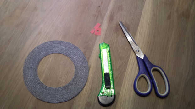 Usted sólo necesita delgada cinta de doble cara (estoy usando cinta de doble cara que tengo para la reparación de pantallas de smartphone/tableta táctil) y un cuchillo de artesanías o tijera.
