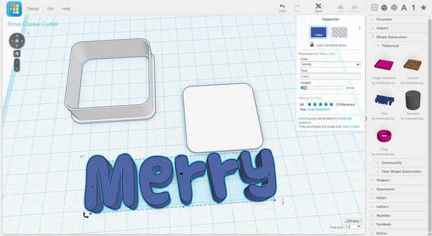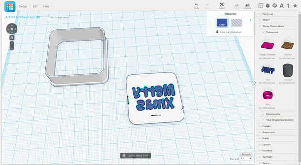 Se trata de una forma rápida y fácil para personalizar su cortador de galletas. Seleccione la herramienta texto en: Forma TinkerCAD/generadores/texto. Coloque el texto por defecto en la placa base. En la ventana de Inspector, reemplace el texto predeterminado con el texto deseado y reducir su altura a 2, 5 mm.