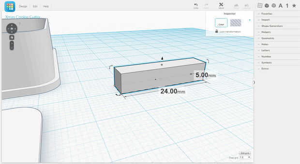 Como paso final, todavía necesitamos añadir un identificador para el cortador de galletas para poder hacer correctamente al imprimir los motivos en la masa. Tinkercad, coloque una forma de caja en el área de trabajo y la escala de longitud de 24 mm, 5 mm de ancho y 5mm de altura. Exportar la .stl a la máquina de cortar de su elección y el diseño para el número de identificadores que necesita se multiplican.