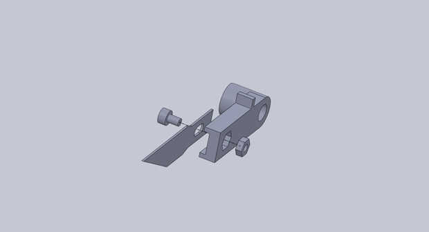 Tome la hoja x-acto, M2 x 3 MM tornillo, una tuerca M2 y la parte de soporte de cuchilla. Si desea, puede pegar la tuerca en su lugar en la parte impresa. A continación, monta como se muestra en la imagen con el tornillo que sujeta la cuchilla en su lugar.