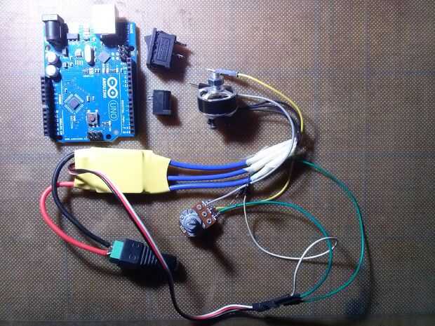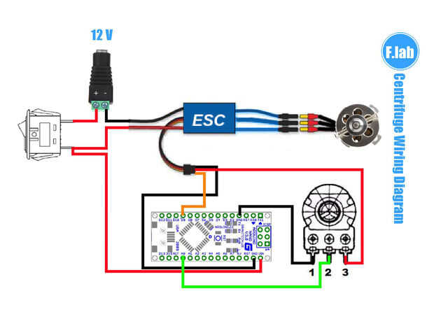 Es una buena idea para programar tu Arduino primero y prueba todo antes de montar la centrifugadora toda. Utilizamosel código se encuentra aquí, que también tiene algunos diagramas útiles e información sobre el código. Todo alambre juntos como se ve en el diagrama de arriba, pero asegúrese de utilizar solamente temporales conexiones entre los cables del motor 3 drone y ESC, porque usted necesitará desconéctelos y vuelva a colocarlos durante el proceso de montaje.