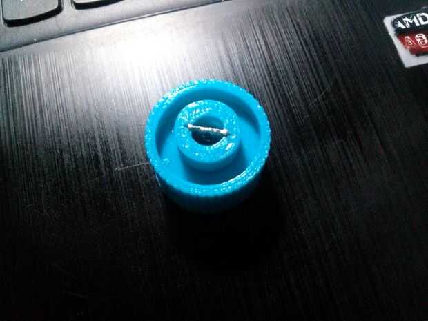 - A continuación, ponga la perilla en el eje del potenciómetro. Usted notará un notch dentro de la perilla. Coloque un trozo delgado de cartón o corte del aluminio (tenga cuidado de no cortarse) en esta muesca que lo ayudarán a mantenerse en el eje. La perilla debe ser realmente extraíble si nunca quiere abrir el caso nuevamente en el futuro así que tenga cuidado si pegar, utilizar pegamento caliente ya que es fácil de quitar sin romper los componentes.