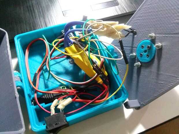 - Esta centrífuga es todavía un "prototipo" tan cuidadosamente los cables en y no te preocupes si parece un lío. Sólo asegúrese de que no dejas los cables/contactos expuestos hacia fuera, y que nada está siendo aplastado o triturado al colocar la cubierta de la caja sobre el cuerpo del caso.