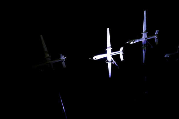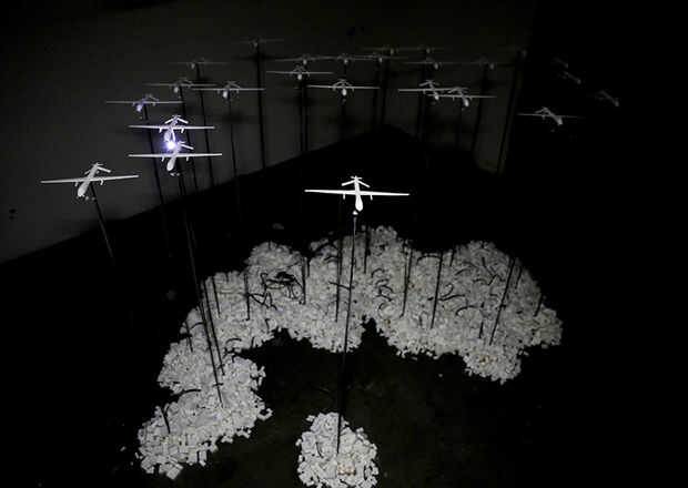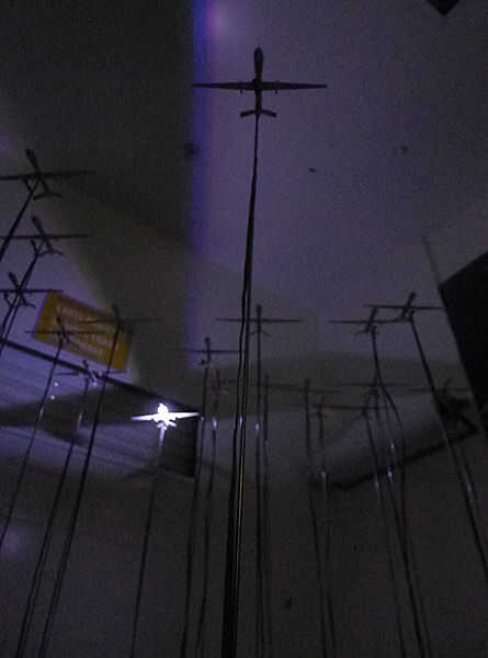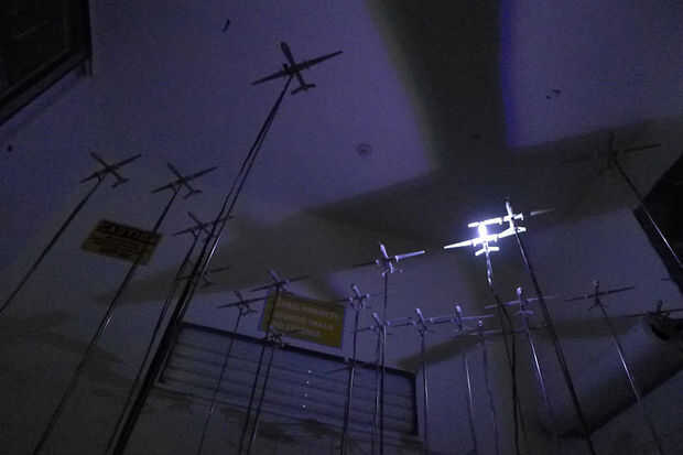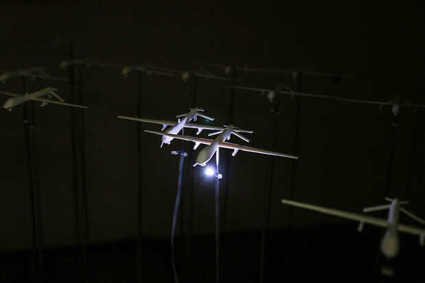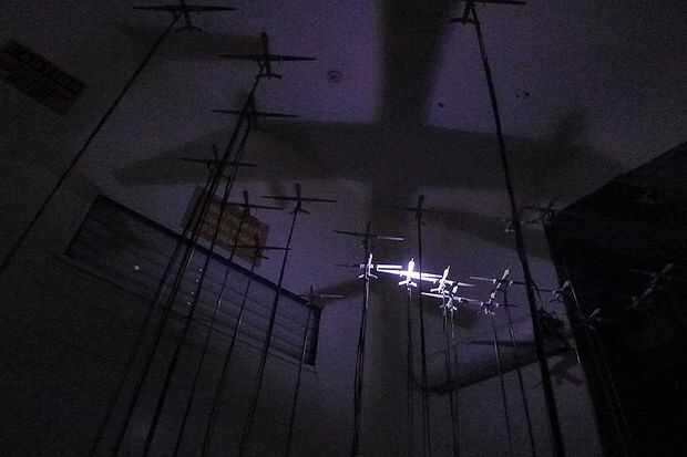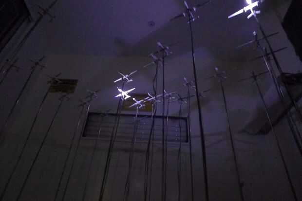 Nuestro objetivo es crear un enjambre en cascada de drone sombras en el techo del espacio. Esta instalación cuenta con 25 aviones, la proyección de esta imagen pero con 415 de ellas toma un espacio mucho más grande y usted consigue la idea...