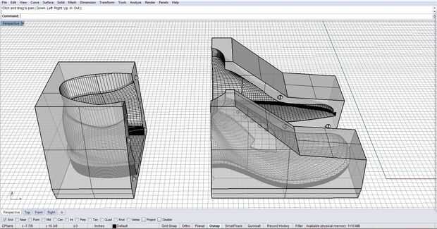 Dibujó un cuadro alrededor del objeto de Rhino, dividir la caja y el objeto con dos planos, luego se unió a las piezas adecuadas en este molde de tres partes. Recortar el molde para mantener tan pequeño como sea posible... esto ahorrará material de impresora. Al mismo tiempo, mantener una forma cuadrada así que usted puede fijarlo con la abrazadera cierre. Hice las piezas de molde que se enclavijan pequeñas protuberancias y hendiduras. Si imprime con ABS u otro filamento con tendencia deformación, estos bloqueos podrían caer fuera de la alineación. Siempre se pueden lijarles hacia abajo si es necesario.