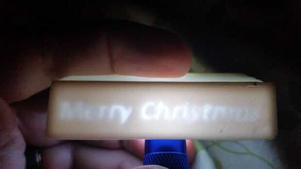 También he añadido una base que tiene un mensaje secreto sólo aparece cuando la luz en su interior está en. Esto puede ser un montón de diversión con luces parpadeantes. El cuadro no lo muestra muy bien pero con la luz en él la base dice "Feliz Navidad" pero está en blanco cuando la luz está apagada.