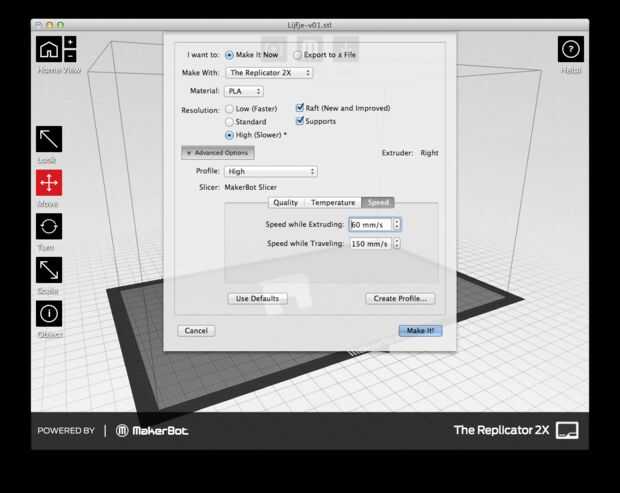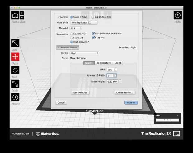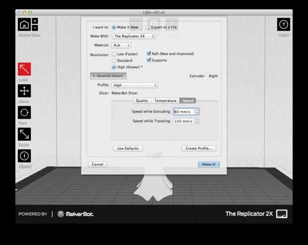Imprimí las piezas desde el controlador de impresora de MakerWare de MakerBot. Son algunas capturas de pantalla con la configuración que funcionó para mí.