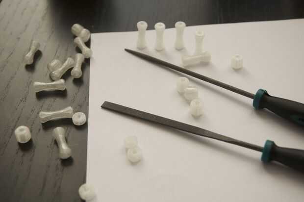 Acabado de las piezas utilizando archivos pequeños o lija. Compruebe los orificios de los granos para hilos de filamento fino. Quitar los hilos de pequeño diámetro alrededor de archivo.