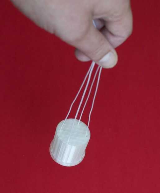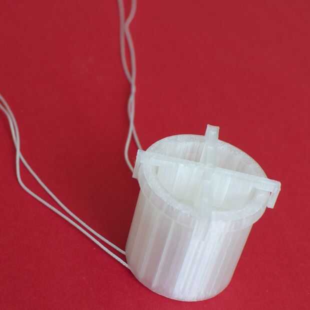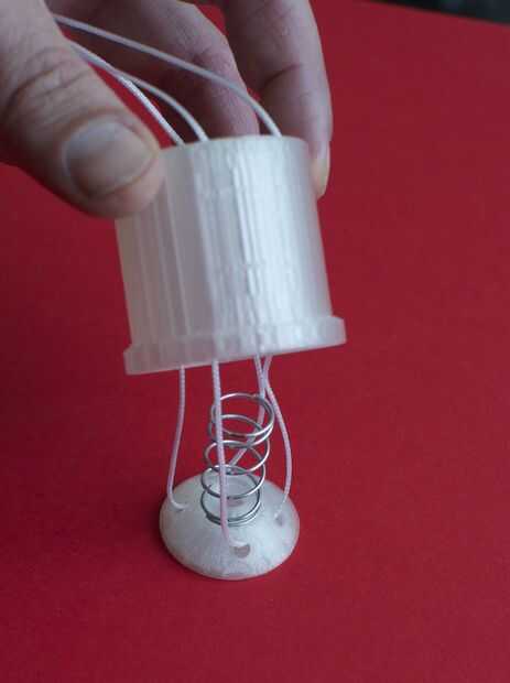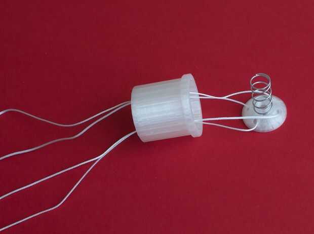 - Recoger las terminaciones cuerda protrusivo y ponga suavemente la base sobre el pulsador con la primavera. Asegúrese de que la primavera se afianzado con abrazadera y centrado en el entre los cilindros en el pulsador y el interior del "techo" de la base.