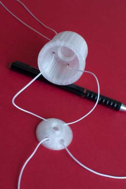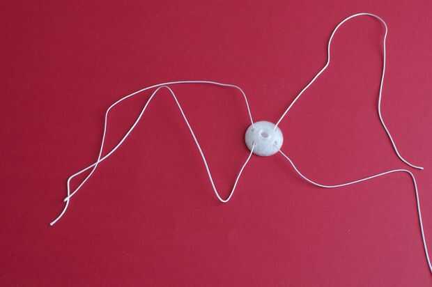 - Pegar las terminaciones de la cuatro cuerda orificios en "el piso" la base, frente a los agujeros del botón. Asegúrese de que las cuerdas no se cruzan entre si.