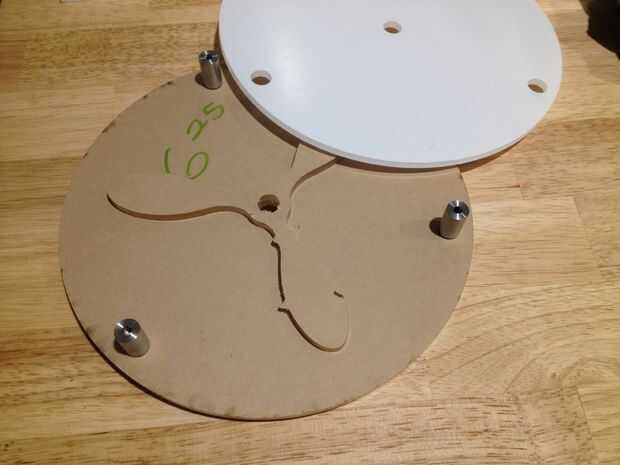 Ahora tenía una escultura mecánicamente de funcionamiento, pero aún necesitaba algo para unirla a. Decidí laser cortó una base con una hélice que se unen al eje. La hélice tiene tres pequeñas protuberancias en el orificio central que mantenga en el eje. Separadores de separan las dos piezas de acrílico sandwich la hélice. Hice algunos cortes de prueba de los agujeros de acrílico para asegurarse de que crearon un ajuste muy ceñido con los separadores y axel. Luego reuní la base con la impresión 3D para asegurarse de que juntos todo lo mueve suavemente. Por último, tomó distancia y tomó el papel que cubre desde el acrílico y había montado nuevamente juntos.