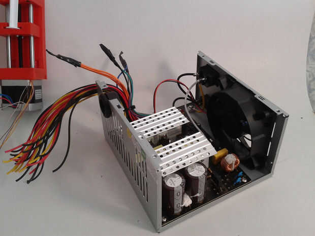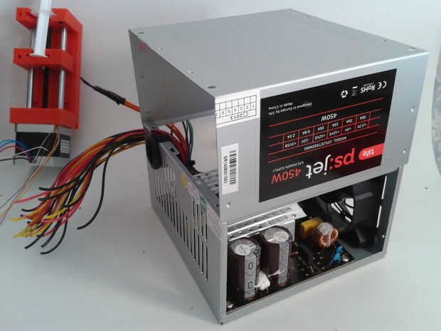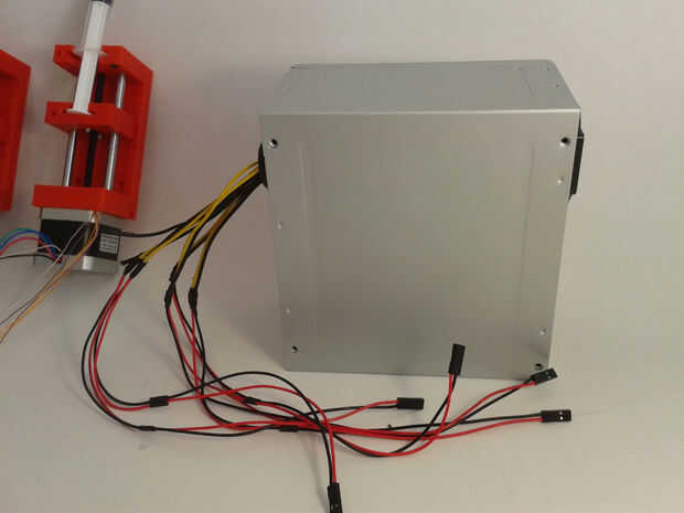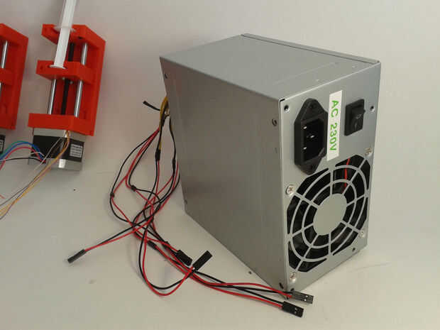 Para los motores de las bombas/paso a paso vamos a necesitar 12V de potencia. Una fuente de alimentación de PC es perfecta para el trabajo, porque tiene mucha corriente, y se necesitan 2A por bomba - 5 bombas de 10A.