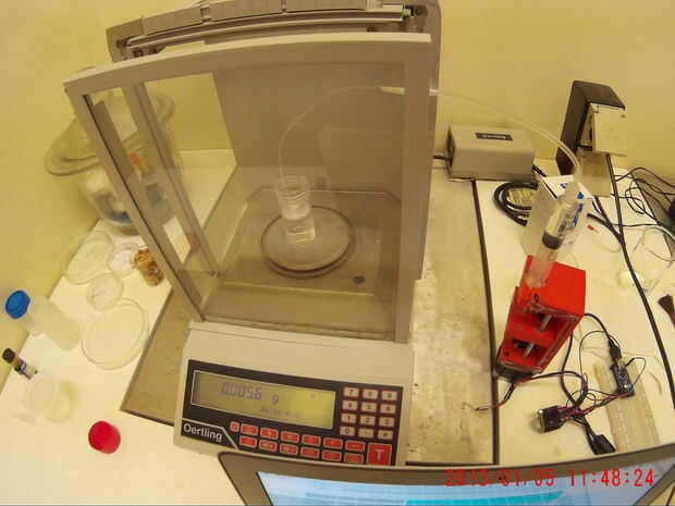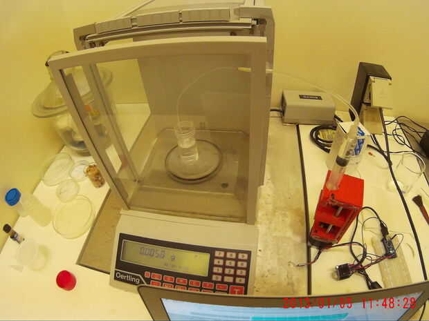 La 3D impreso bomba de jeringa fue puesta a prueba utilizando una balanza de pesaje analítico.