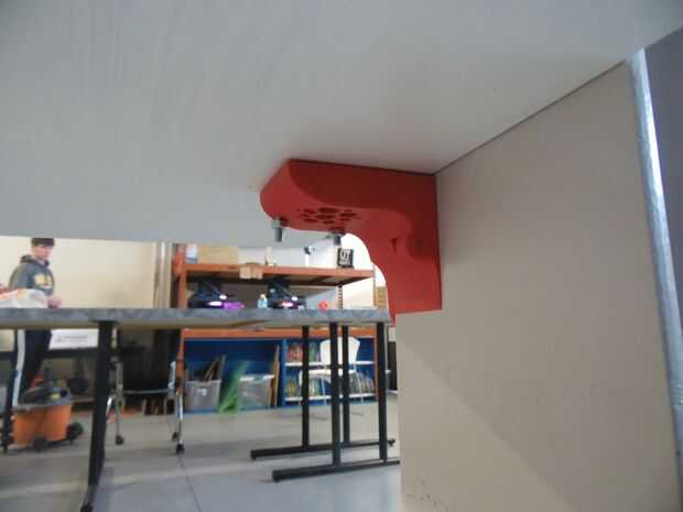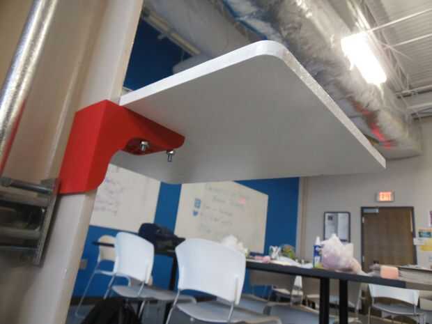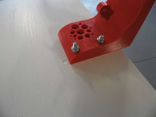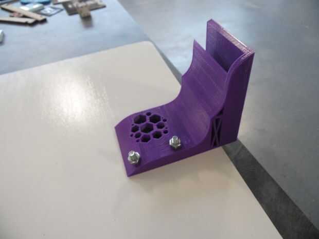 Los pernos de carruaje galvanizado fueron utilizados para fijar los tableros acabados en los soportes de impresión 3D. Eran 2" largo, 1/4" de diámetro para el rojo y 1.25" largo, 1/4" de diámetro para los soportes de color púrpura y verdes. tuercas de 1/4" utilizaron para pegarlas firmemente, y luego los estantes simplemente deslice a la viga.