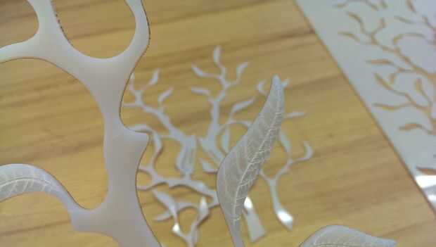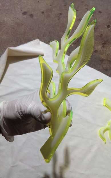 Cada bifurcación en las ramas es de tres capas: una capa más amplia central de acrílico UV verde, intercalada entre dos capas más estrechas de acrílico blanco.