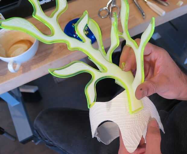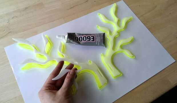 Una vez que se cortaron, pegué las tres capas junto con E6000, y después de que éstos se habían secado pegué las ramas más pequeñas dentro de las muescas en los más grandes, creando así las dos astas/ramas.