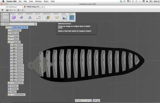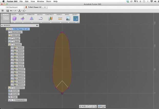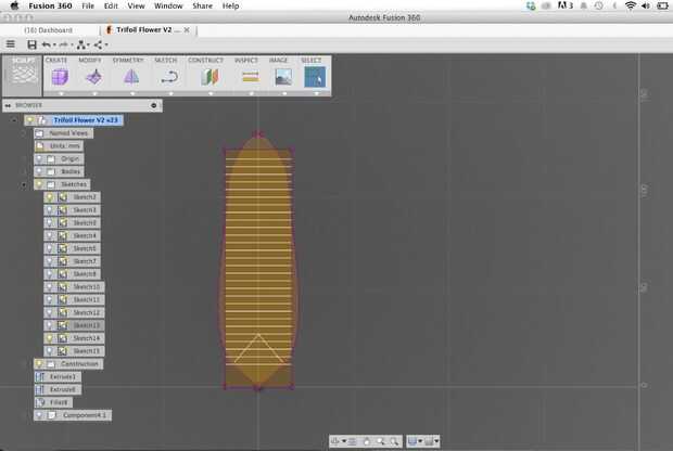 Para modelar mis pétalos, primero creé un esbozo de la forma de pétalo quería en fusión 360 y luego para crear el pétalo base extruido. He creado las espinas por esbozar el perfil de base de cada columna en la parte superior este pétalo y luego sacando ellos, dándoles un ángulo de afilado en como fue para arriba.