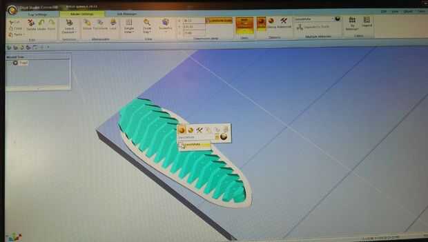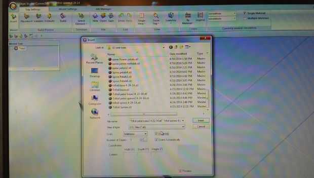 Yo entonces importados mis archivos en el software de impresión de Objet haciendo shift + clic en ambos archivos e importarlos como un conjunto. Esto debería llevarlos en el software de impresión correctamente alineado. Una vez que los archivos fueron importados, hace clic en las espinas y la base por separado y les asigna diferentes materiales (Tango Plus para la base y Vero por las espinas). Estos pétalos planos generalmente tomaron alrededor de una hora o una hora y media para imprimir.