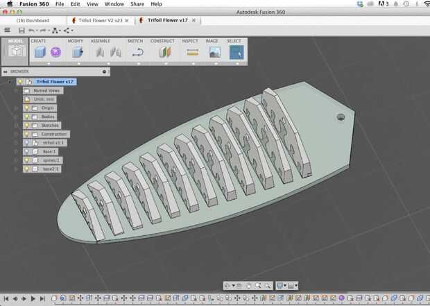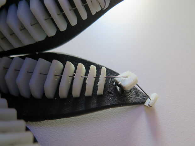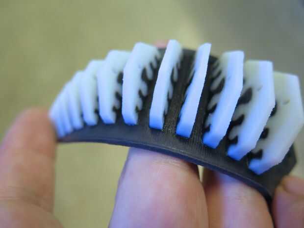 Luego probé lo contrario: incrustar el material blando de la base en el material duro de las espinas. Esto funcionó bastante bien. Hice el cruce entre los dos parecen un poco a una cremallera o una cola de Milano común por lo que fue mucho más difícil que separar. También puse un filete en las esquinas donde las espinas cumplen la base por lo que no había bordes duros. Todo esto fue un poco más complicado desde un punto de vista del modelado, pero pagado apagado y sobre todo paró la espinas de separar.
