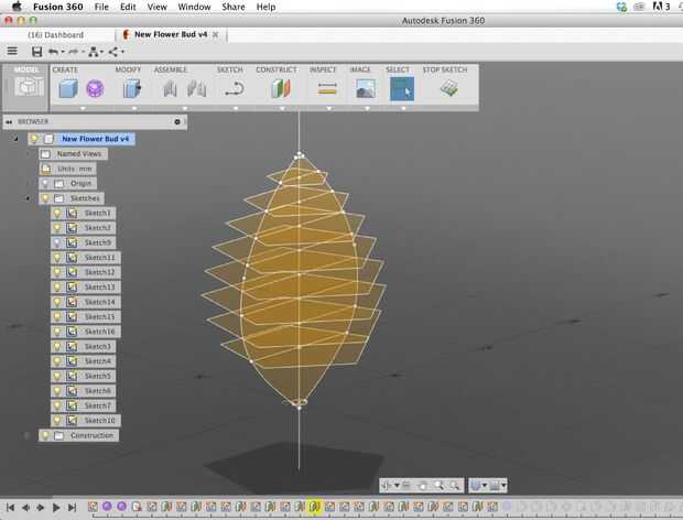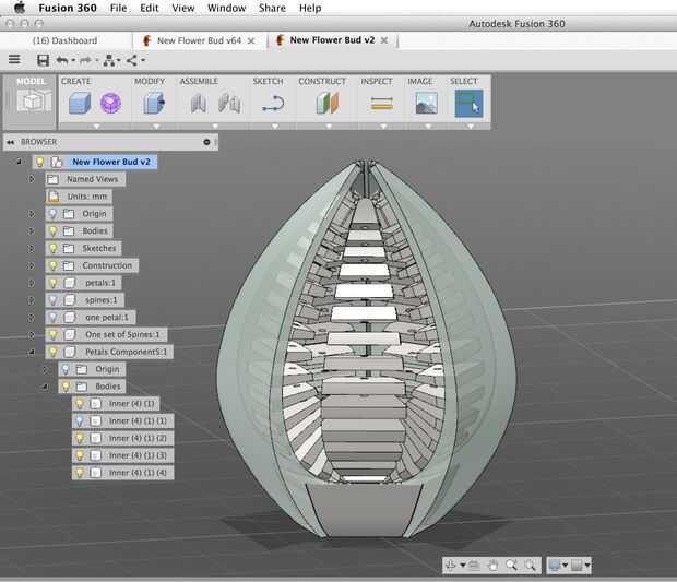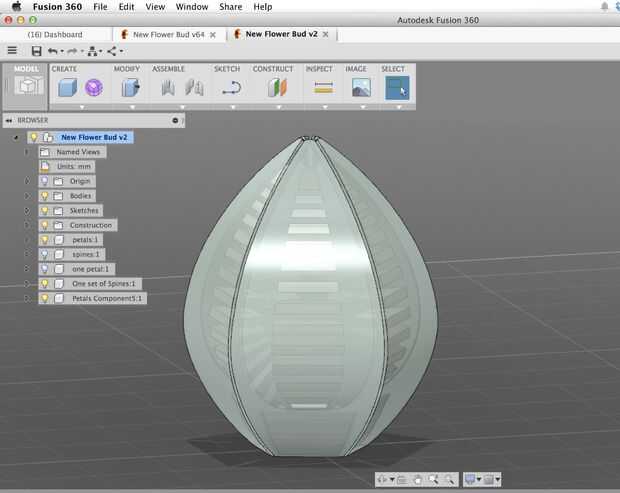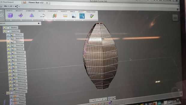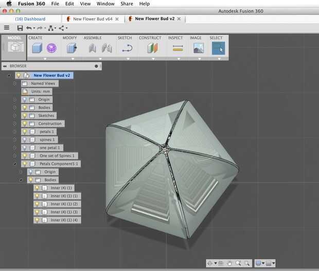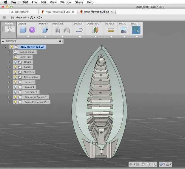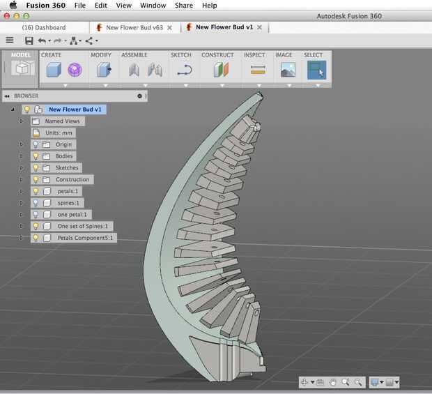 Después de se movieron en el entorno de modelado, divide mi forma de cinco pétalos y descartados todos menos uno. Luego añadir las espinas y otras características a este un pétalo y lo vistió alrededor de 5 veces. Me aseguré que todos los pétalos conectan en una base sólida (que sería impreso en un material duro), pero que había un poquito de espacio entre la parte superior de los pétalos pueden ser pelado abierto después de que fueron impresos.