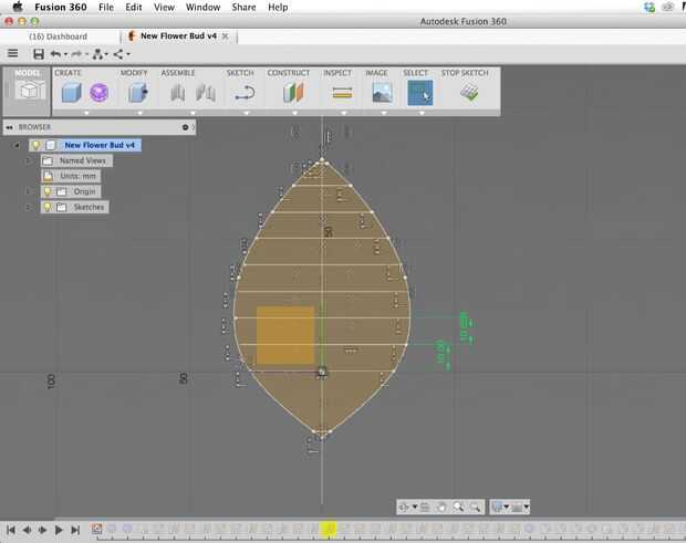 Empecé dibujando un boceto de la forma de bud que quería en fusión, tratando de mantener la curva de los lados lisos. Yo sabía que quería la flor tiene 5 pétalos, y que cada pétalo debe ser plana en el exterior, por lo que esbozado una serie de pentágonos en diferentes planos, cada unos mm por encima de la última, siguiendo el perfil de bud que había bosquejado. Entonces abuhardilladas entre estos pentágonos en la fusión esculpen entorno para crear la forma básica de la yema entera.