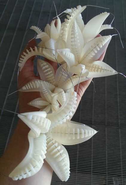 Después imprimí mis flores pongo los cables en los pétalos para mantenerlos abiertos. Tuve la mejor suerte con un calibre de 24-28 galvanizado alambre de acero se puede comprar en una ferretería que se doble y mantenga su forma. Rosca el cable hacia abajo a través de los orificios de las espinas de cada pétalo y me coloca en alrededor de los dos orificios en la espina dorsal en el extremo para sujetarla. Cuando modeló las flores también puse los agujeros en la base de cada pétalo que pegué los extremos de cada alambre en para mantenerlos abiertos. Una de las cosas agradables acerca de esta forma es que usted puede elegir cuánto usted desea los pétalos para abrir y utilizar los cables para dar variación en la forma.