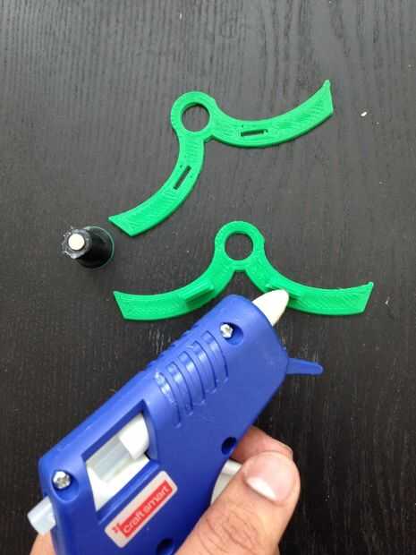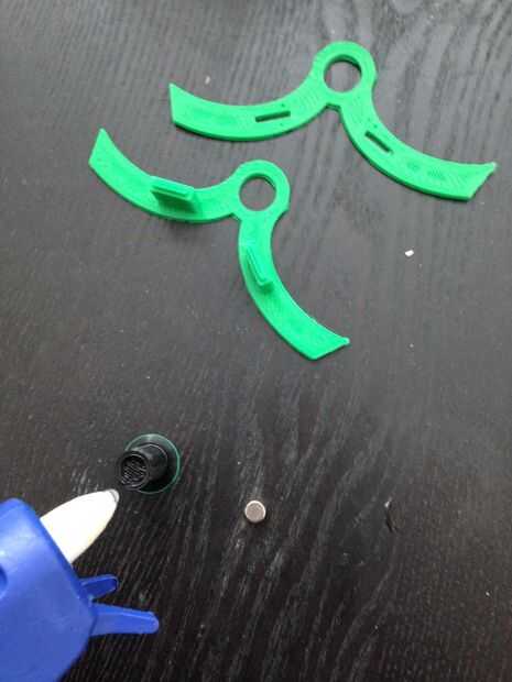 Usando la pistola de pegamento caliente, pegar el imán en el soporte magnético negro como se muestra en la primera foto.