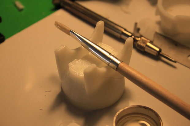 Para fundir la pieza entera y hacerla más fuerte, yo pinto sobre la superficie con un pincel cargado de cloroformo o MEK. Esto derrite el plástico y crea una superficie homogénea. Esta superficie es más fuerte, arenas más fácil y puede tomar pintura más eficazmente.