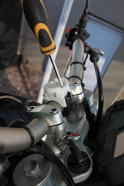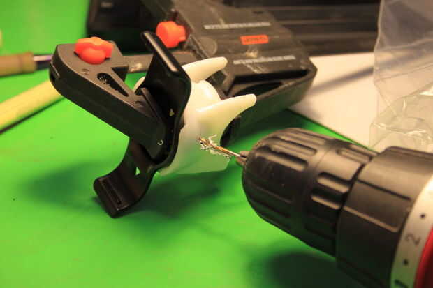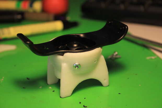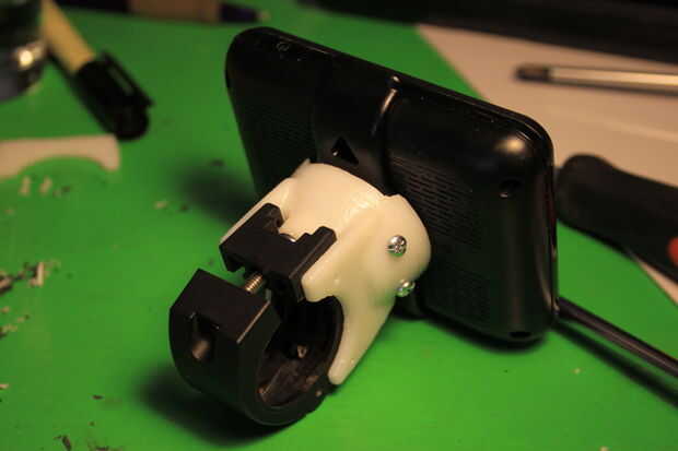 He optado por sujetadores mecánicos sujetar todo el soporte impreso a la cuna Nuvi. Esto es debido a que los componentes son diferentes tipos de plástico y no confío en un adhesivo para unir estos dos sobre baches y caminos accidentados.