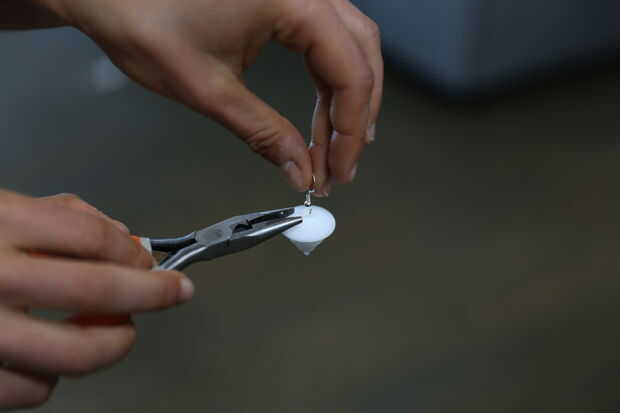 Una vez terminada la impresión, utilice un par de alicates pequeños o cortadores para limpiar el material de apoyo. Utilice los alicates de punta para abrir el puente de un gancho del pendiente. Deslice su impresión sobre el puente y presione hacia adentro para cerrar.